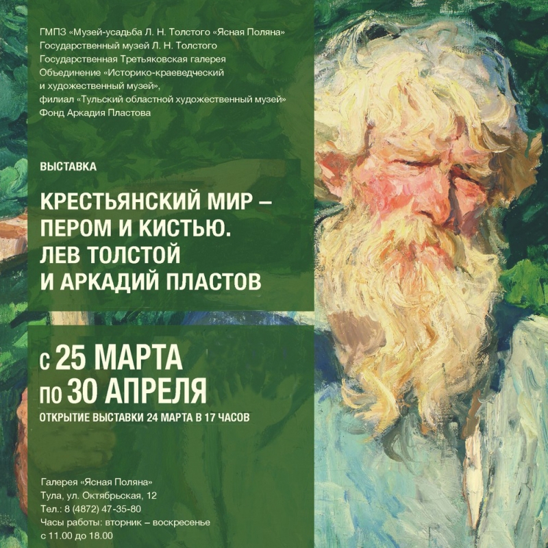24 марта открылась выставка работ художника Аркадия Пластова «Крестьянский мир пером и кистью. Лев Толстой и Аркадий Пластов» в галерее «Ясная Поляна» (г.Тула, ул.Октябрьская, 12). Выставка продлится до 30 апреля 2017 года. Посетить ее можно со вторника по воскресенье с 11:00 до 19:00.