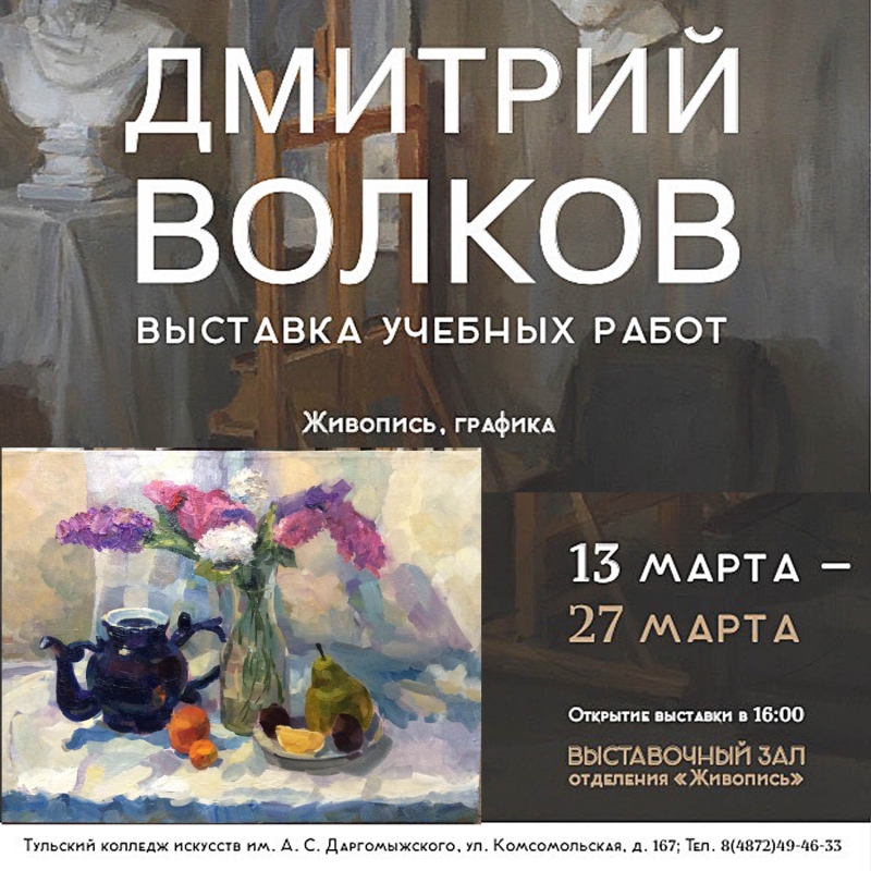 17 февраля 2018 года в выставочном зале Тульского колледжа искусств им. А. С. Даргомыжского открылась территориальная художественная выставка-конкурс академических заданий по живописи для учащихся художественных школ и школ искусств Тулы и Тульской области. Тема НАТЮРМОРТ.