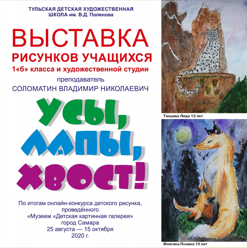 На выставке представлены работы учащихся 1 «Б» класса, преподаватель Соломатин В. Н., выполненные на онлайн-конкурс детского анималистического рисунка «Усы, лапы, хвост!»
