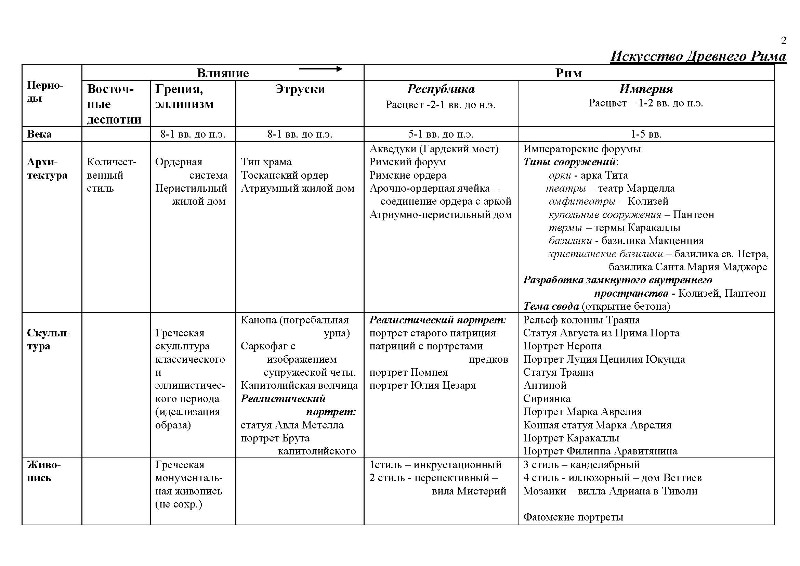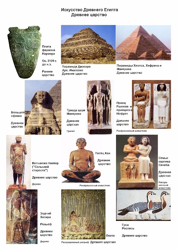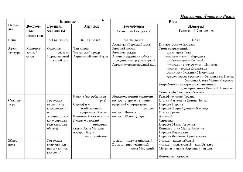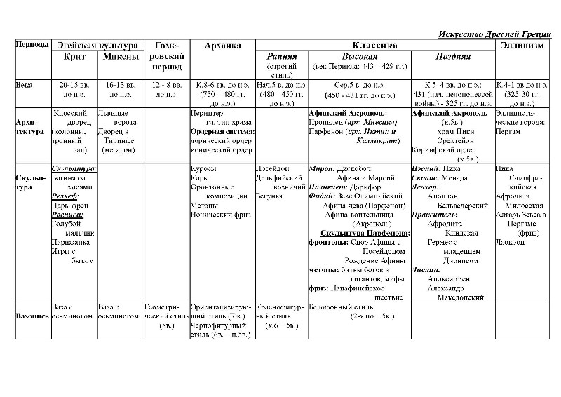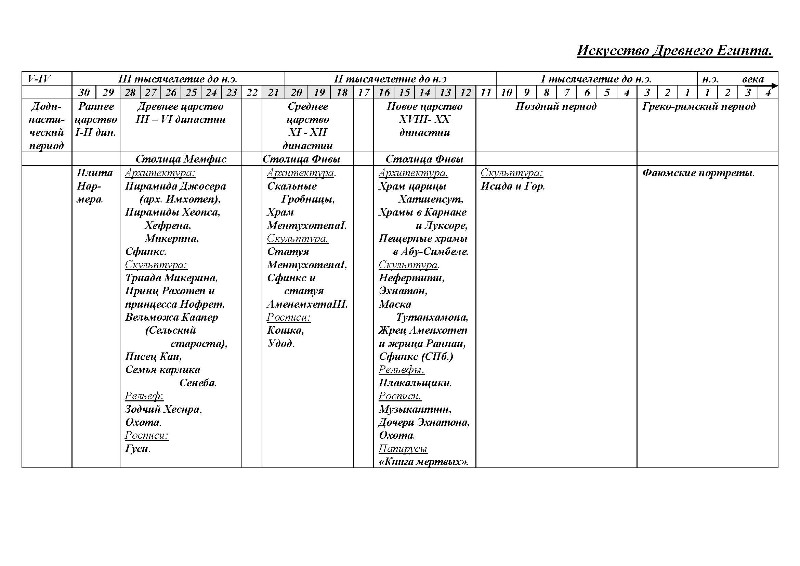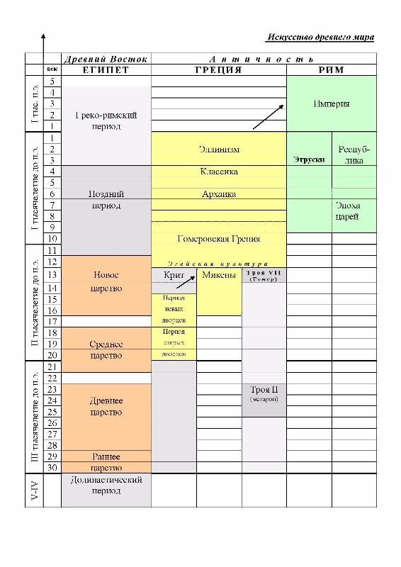 Представлены материалы по темам "Искусство Древнего Египта", "Искусство Древней Греции", "Искусство Древнего Рима" в виде таблиц с обозначением основных исторических периодов и выделением наиболее интересных памятников, которые надо обязательно запомнить. Эпохи развития искусства "посажены" на шкалу времени.