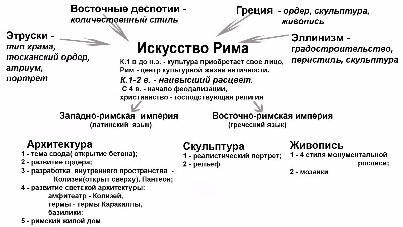 Приведенные материалы не являются учебником, это краткий конспект, структура тем, цель которых - помочь учащимся разобраться в последовательном развитии искусства не на основе голых схем и дат, а наглядно, с помощью рисунков, ведь у художников всех эпох рисунок -- это не только способ выражения своего отношения к действительности, но и способ ее познания.
