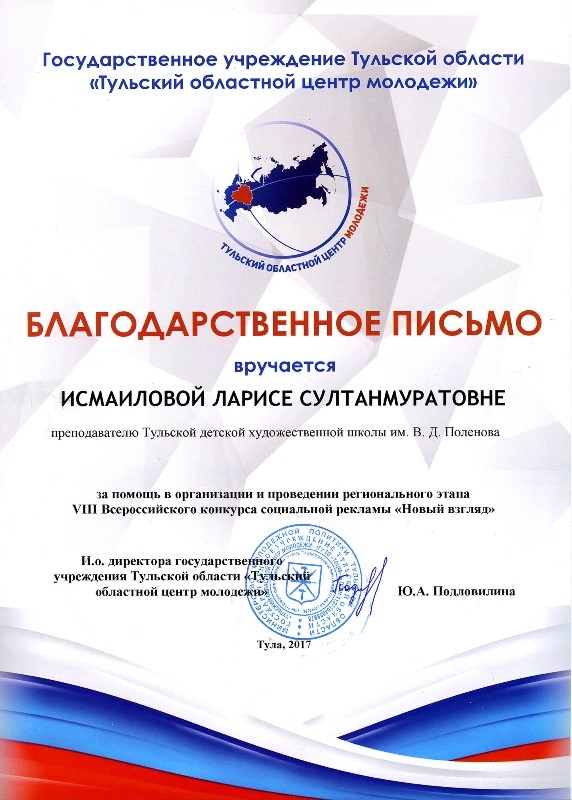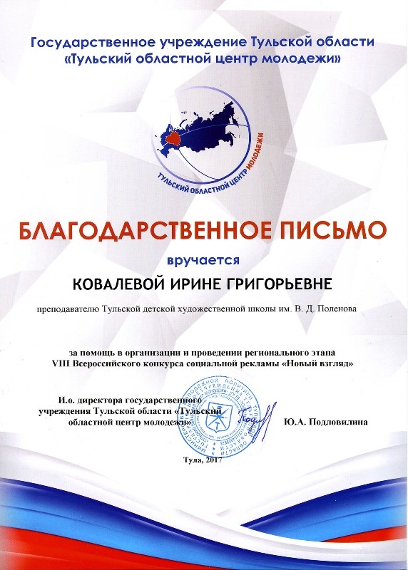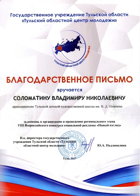 9 октября 2017 года в Тульском областном центре молодежи состоялась церемония награждения победителей регионального этапа VIII Всероссийского конкурса социальной рекламы "Новый взгляд". Участники конкурса представили на суд жюри свыше ста работ – плакатов и видеороликов, темами для которых стали всевозможные проблемы, существующие в современном обществе. В номинации "Новый взгляд" глазами детей" всех удивили своим не по годам взрослым взглядом на проблемы современности Анастасия Артемюк (преподаватель Тараторкина Н. С.), Софья Руч (преподаватель Ковалёва И. Г.), Дарья Бабаева (преподаватель Соломатин В. Н.) учащиеся Тульской ДХШ им. В. Д. Поленова, занявшие первое, второе и третье место в этой номинации. Всего учащимися нашей школы было представлено на конкурс 27 работ. Победителей и участников приветствовала заместитель председателя правительства – министр молодежной политики Тульской области Юлия Вепринцева. «Очень здорово, что с каждым годом все больше людей присылают свои работы. Значит, вам небезразлично то, что происходит вокруг. Вы обращаете внимание на разные социальные проблемы и даже видите пути их решения, что и отражено в ваших работах. Желаю вам дальнейших успехов в самореализации», – сказала Юлия Вепринцева. Победители и призеры конкурса получили дипломы и ценные подарки. Ребята, завоевавшие первые места, представят свои работы на Всероссийском конкурсе. Всероссийский конкурс «Новый Взгляд» – крупнейший молодежный проект в области социальной рекламы. За 8 лет реализации проекта в адрес дирекции поступило около 38 тыс. работ из 85 регионов страны.