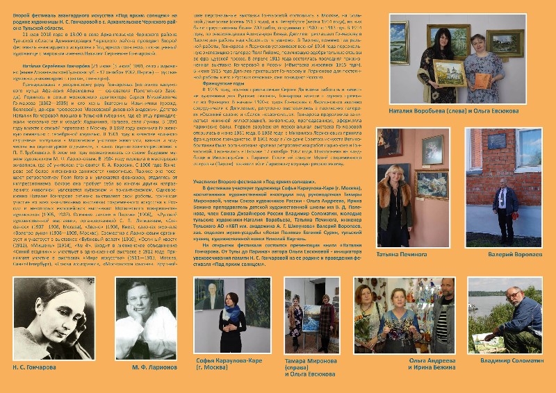 21 мая 2018 года в с. Архангельское Чернского района Тульской области прошел второй фестиваль авангардного искусства "Под ярким солнцем", посвященный памяти художницы Наталии Сергеевны Гончаровой. Организаторы фестиваля: Администрация Чернского района Тульской области; литератор, член Русского Географического Общества, главный редактор газеты "Тульский художник" Ольга Евсюкова. На фестивале были представлены акварельные пейзажи преподавателя Тульской ДХШ им. В.Д. Поленова и его учеников: Бабаевой Дарьи, Головкиной Ольги, Мамыкиной Варвары, Пешехоновой Наталии, Становова Алексея.