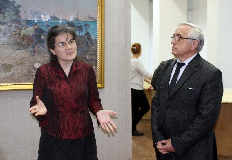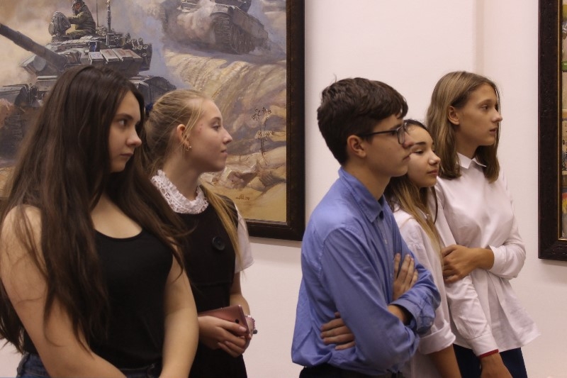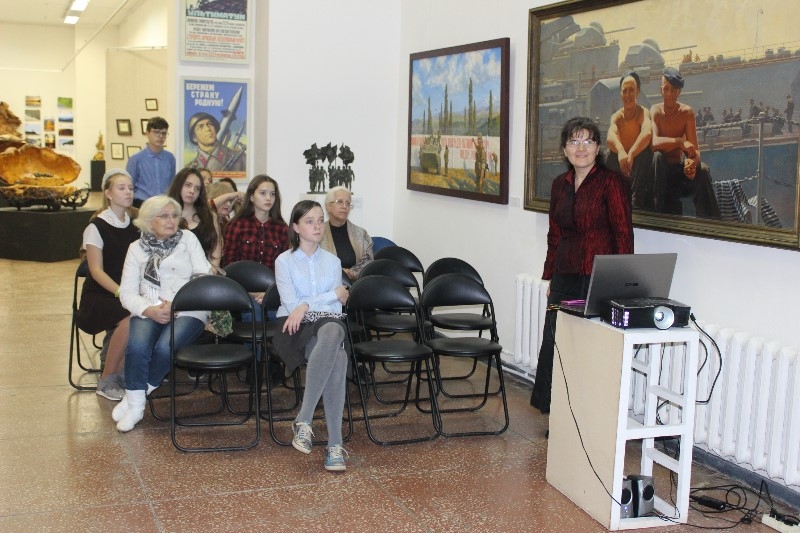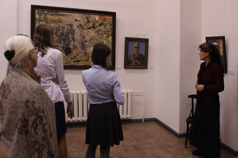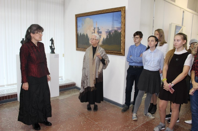 17 октября в 17:00 в Выставочном зале в экспозиции выставки «Несокрушимая и легендарная» состоялась творческая встреча учащихся художественной школы с летчиком запаса, руководителем клуба православных писателей «Родник» при храме Преп. Сергия Радонежского В.С. Алешиным. После беседы по картине «Портрет А. Прохоренко» (Автор Ю.А. Бирюков, Студия военных художников им. М.Б. Грекова) дети познакомились с художественной видеоработой В.С. Алёшина «Вызываю огонь на себя», посвящённой героически погибшему 17 марта 2016 года в боях за сирийский город Пальмира старшему лейтенанту А.А. Прохоренко. Юлия Алексеевна Хрунова провела для учащихся экскурсию по выставке «Несокрушимая и легендарная»
