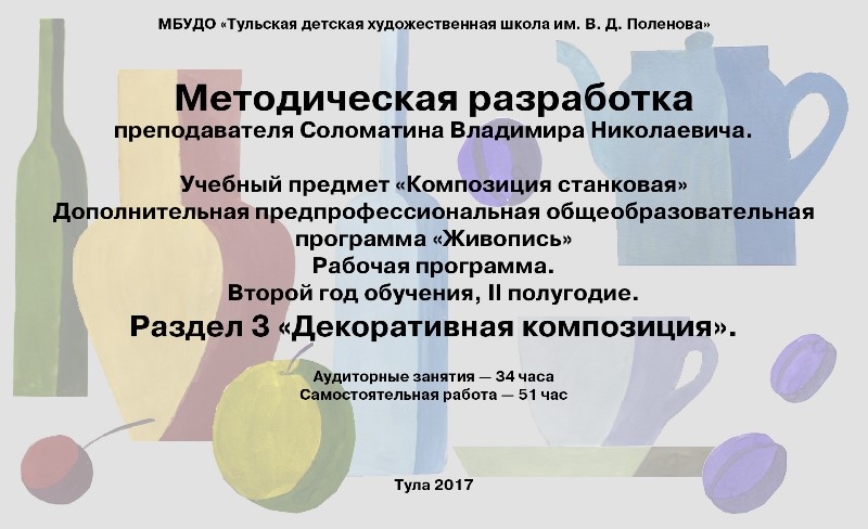 Учебный предмет «Композиция станковая» Дополнительная предпрофессиональная общеобразовательная программа «Живопись» Рабочая программа. Второй год обучения, II полугодие. Раздел 3 «Декоративная композиция». Аудиторные занятия — 34 часа Самостоятельная работа — 51 час