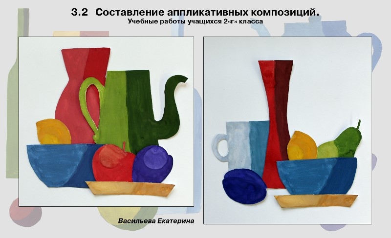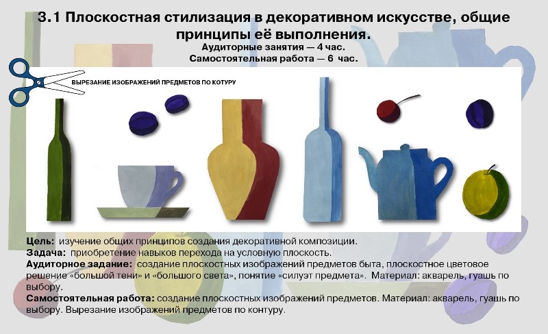 Аудиторное задание: создание плоскостных изображений предметов быта, плоскостное цветовое решение «большой тени» и «большого света», понятие «силуэт предмета». Материал: акварель, гуашь по выбору.
