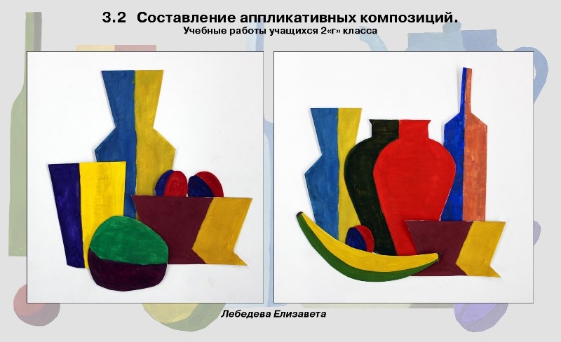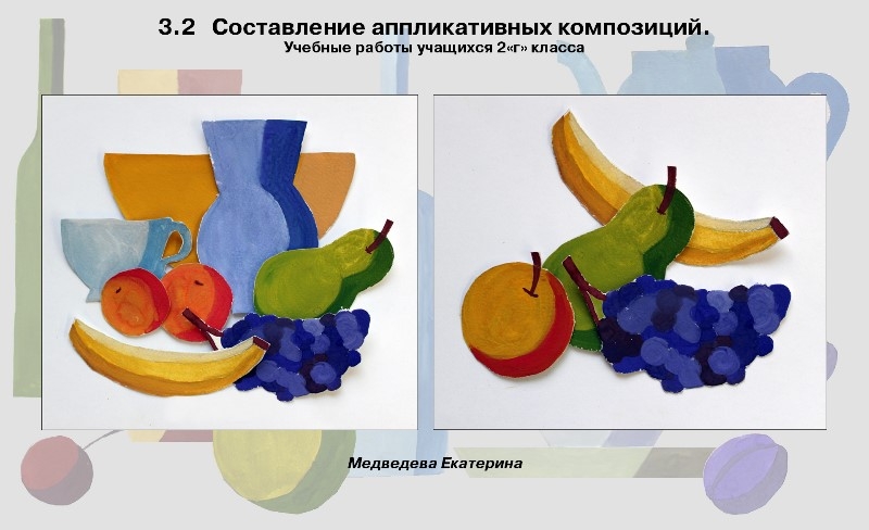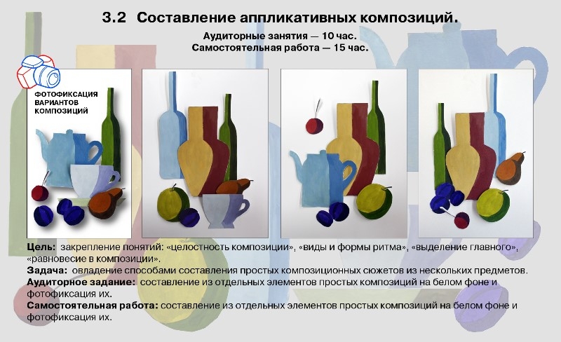 Самостоятельная работа: эскизы плоскостных декоративных натюрмортов с ограниченным использованием цветов (3 — 5 цветов).
