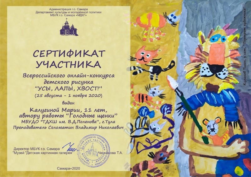 Анималистический жанр – один из древнейших и популярных жанров детской и взрослой аудитории. Доказательство тому – рисунки животных в пещере Ласко во Франции, которые удивляют точностью передачи характера и повадок зверей и одновременно глубиной художественного образа. Муниципальное бюджетное учреждение культуры городского округа Самара «Музей «Детская картинная галерея» пригласила к участию в конкурсе детского рисунка «Усы, лапы, хвост!» всех желающих. На онлайн-конкурс детского анималистического рисунка «Усы, лапы, хвост!» было прислано более 1500 работ из 29 городов и населенных пунктов Самарской, Ленинградской, Архангельской, Орловской, Свердловской, Амурской, Рязанской, Тульской областей, Удмуртии, Донецкой народной республики, Владивостока, Южно-Сахалинска, Хабаровска, Омска, Пензы, Смоленска. Юные художники в своих рисунках рассказали о любимых питомцах, о представителях огромного и разнообразного мира природы. Конкурс проводился в период с 25 августа по 15 октября 2020 года. Всем участникам организаторы выслали сертификаты за каждую представленную работу. По итогам конкурса в Тульской детской художественной школе им. В. Д. Поленова была организована выставка рисунков учащихся 1 «Б» класса, преподаватель Соломатин В. Н.