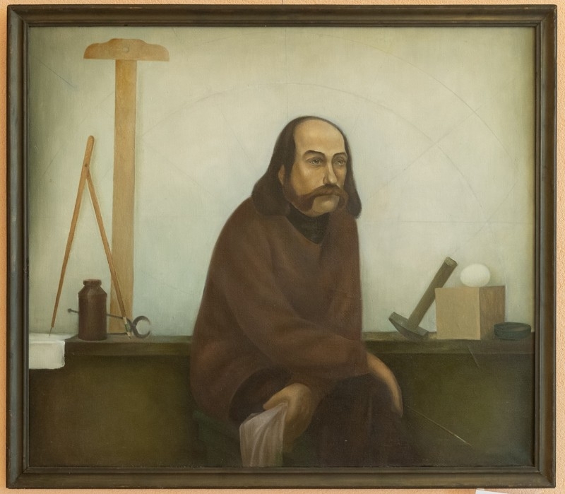 Герой картины «Володя», похожий на средневекового иконописца, художник Владимир Тимофеев, изображен отдыхающим. Темный силуэт Володи - размеренный, каноничный, строгий. Цветовая гамма очень сдержанная, под стать образу, основой колорита стали тут традиционные земли: охра, сиена, марс. Стена позади него – белая. Пауза. Силуэту Володи вторит большая вертикаль линейки на стене, держит композиционное равновесие.