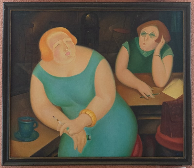 Есть на полотнах художника и модницы, они явно считают себя красотками, а взглянешь со стороны и усмехнешься. Не зло, а по-доброму. Ведь так хотят эти дамы быть контрастными этому миру, а не получается. Мастер, посмеиваясь, вскрывает их суть. Угловатые модницы, а душа-то, душа… мягкая, как булка с маслом и сахаром. Тот же вкус детства. Пройдет время и станет модница, вся треугольная, неоновая, кукольная – уютной домашней женщиной, округлой и мягкой. Героиней работ «Окские крачки» или «Большая чашка кофе». Или такой вот пронзительно-грустной, как героиня портрета «Ирина», которая смотрит прямо в душу зрителя прекрасными карими глазами.