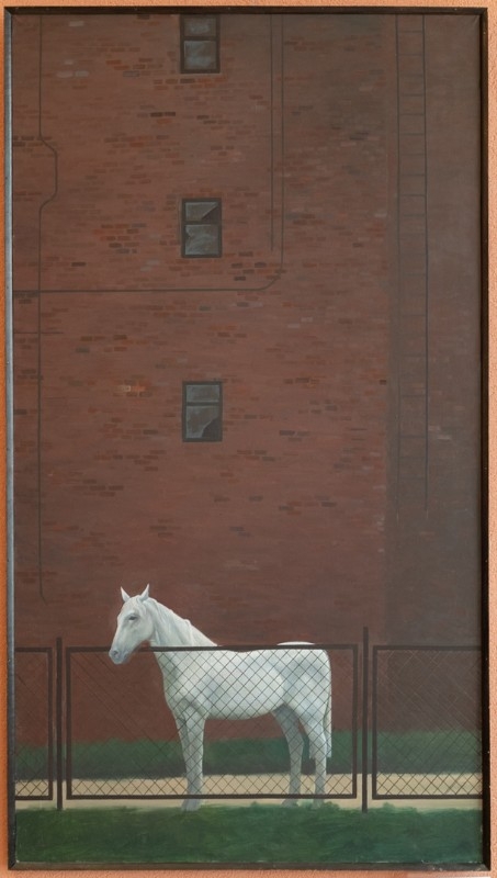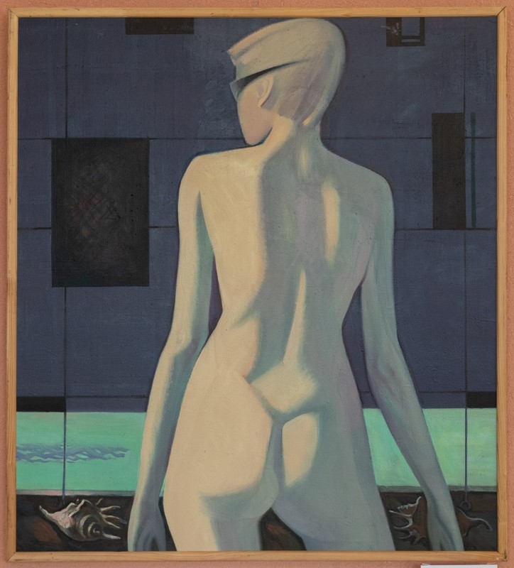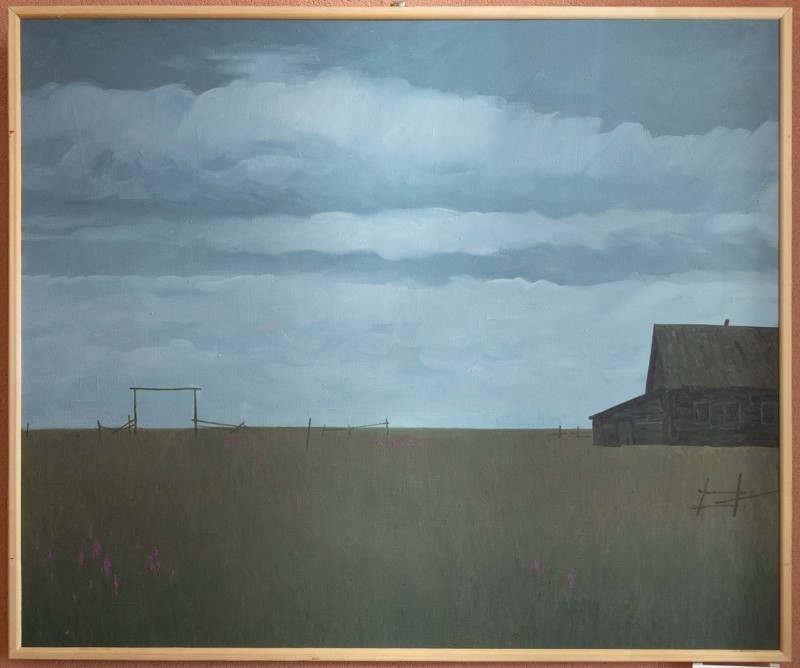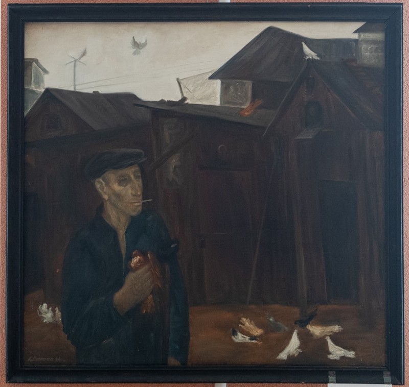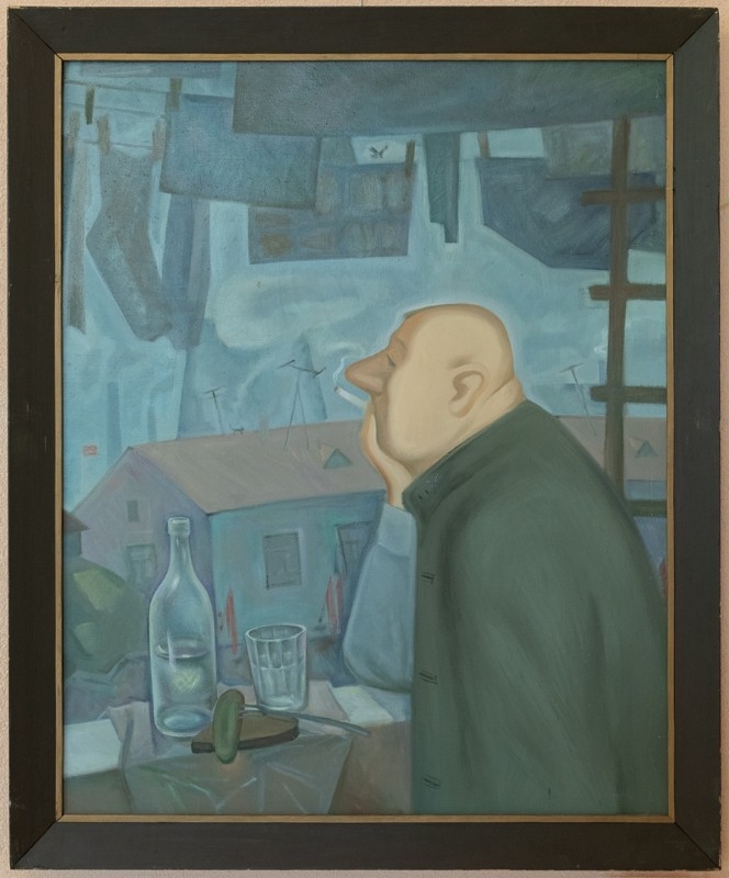 Но в отличие от великолепных мастеров «сурового стиля» молодой художник уже тогда избрал героями своих картин не монументальных строителей светлого будущего, а уютных, незаметных и вовсе не героических людей. Тех, кто трудятся и живут рядом. Из года в год. Соседи. Соседи мечтатели. И окружение им под стать. Они никогда не возвышаются над низким горизонтом. Их мир максимально приближен к зрителю. Дача, провинциальная улочка, квартира с простеньким интерьером «как у всех». Нет отчего же… Такой человек честно трудится. А дома – отдыхает. Выйдет на балкон, нальет стопочку, покурит. А день вокруг туманный, серо-голубой. («Дядя Ваня»)