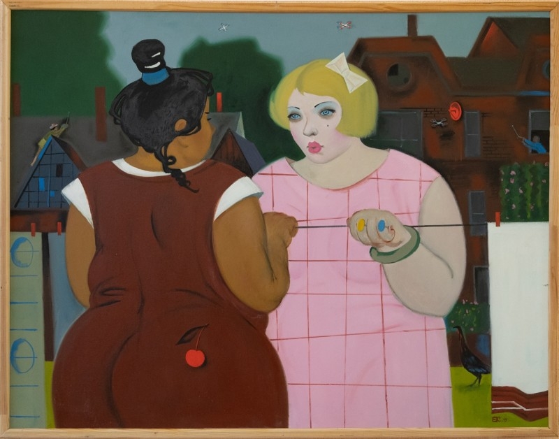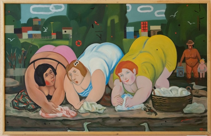 Три девицы под окном – усталые женщины после бани на картине «Женский клуб» - намек на известную с детства сказку, не иначе. Чего ждут, какими тайнами делятся о чем мечтают? Как и все женщины - о любви, конечно. А может вспоминают былое. Кошка играет с клубочком, а над дамами сушатся полосатые коврики. «…Три девицы под окном, пряли поздно вечерком…»