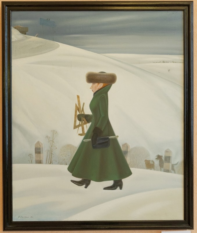 Остроносая дамочка в зеленом пальто с лисьим воротником на картине «Дорога на Выглядовку» по пластике, несколько готической, тоже близка «Володе». Две картины в экспозиции рядом висят. Ведут диалог.