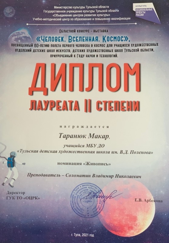 14 апреля в выставочном зале Тульского Союза художников состоялось открытие выставки конкурса «Человек. Вселенная. Космос», посвященного 60-летию полета первого человека в космос и приуроченного к Году науки и технологий в России. Конкурс-выставка «Человек. Вселенная. Космос» проходит в рамках национального проекта «Культура». Основными целями конкурса-выставки являются сохранение и поддержание традиций русской школы изобразительного искусства, выявление наиболее талантливых учащихся в академической системе художественного образования и воспитание патриотических чувств, гордости за достижения своей страны в области изучения космоса.На конкурс было представлено 112 работ в номинациях «Живопись», «Рисунок» и «Декоративно-прикладное искусство». Их авторы – учащиеся художественных отделений 20 детских школ искусств Тульской области в возрасте от 7 до 17 лет. Мероприятие открыла ведущий методист учебно-методического центра по образованию и повышению квалификации Объединения центров развития культуры Светлана Коновалова. С приветственным словом к участникам обратился председатель Тульского областного отделения Всероссийской творческой общественной организации «Союз Художников России» Евгений Николаевич Жидков, который высоко оценил работы ребят и отметил, что Тульская земля всегда славилась талантливыми мастерами, отличавшимися умом, смекалкой, мастерством, любовью к прекрасному, эти качества присущи и юным художникам. Члены конкурсной комиссии преподаватель Тульского областного колледжа культуры и искусства Светлана Фаритовна Ямалиева и преподаватель Тульского колледжа им. А. С. Даргомыжского Ольга Сергеевна Кудряшова подчеркнули, что тема космоса вызвала творческое вдохновение у юных художников региона. На конкурс представлены оригинальные и глубинные художественные работы. Темы освоения космического пространства, героического труда космонавтов многие десятилетия увлекают фантазию юных художников, дают яркий творческий импульс. Лауреаты конкурса награждены памятными призами и дипломами победителей, участникам вручены благодарственные письма.