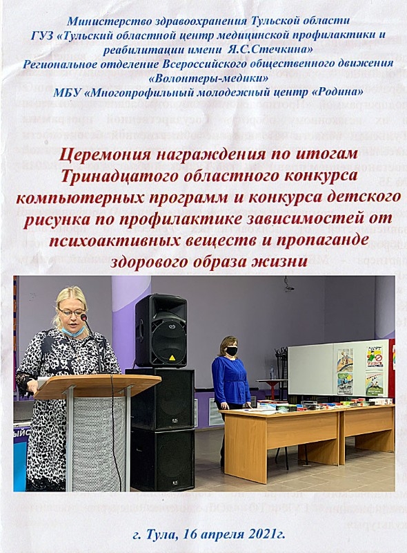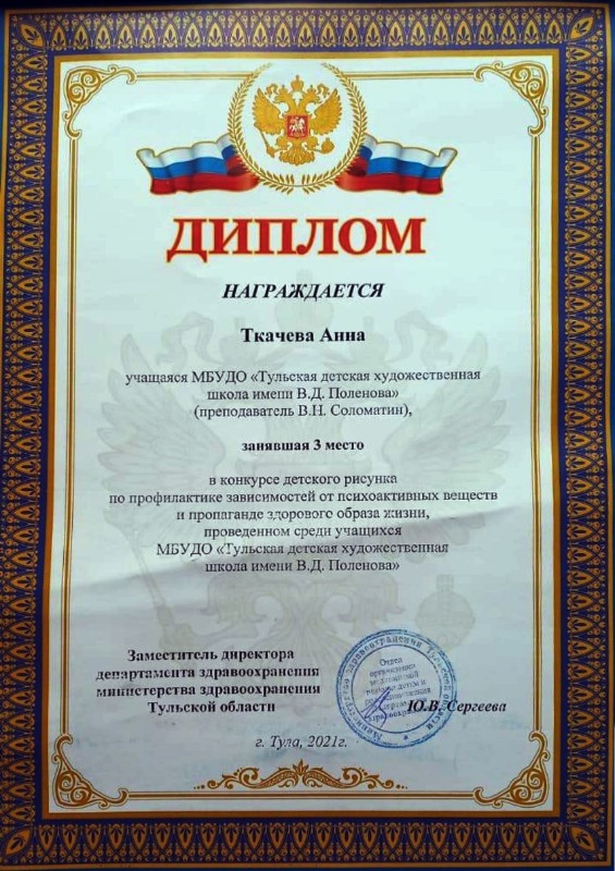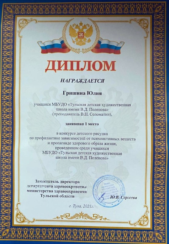 16 апреля в молодежном центре «Родина» прошёл финал ежегодного областного конкурса детского рисунка по профилактике зависимостей от психоактивных веществ и пропаганде здорового образа жизни. Организатор мероприятия – Тульский областной центр медицинской профилактики и реабилитации имени Я.С. Стечкина. Цель конкурса - повысить информированность молодежи о вредном воздействии психоактивных веществ. Победителями стали учащиеся Тульской ДХШ им. В. Д. Поленова: Гришина Юлия «Здоровье — твоё богатство!» 1 место, преподаватель Соломатин В. Н., Невская Анастасия «Жизнь без наркотиков», 2 место преподаватель Глушнёва Л. Н., Ткачёва Анна «Победа» 3 место, преподаватель Соломатин В. Н.