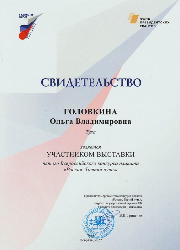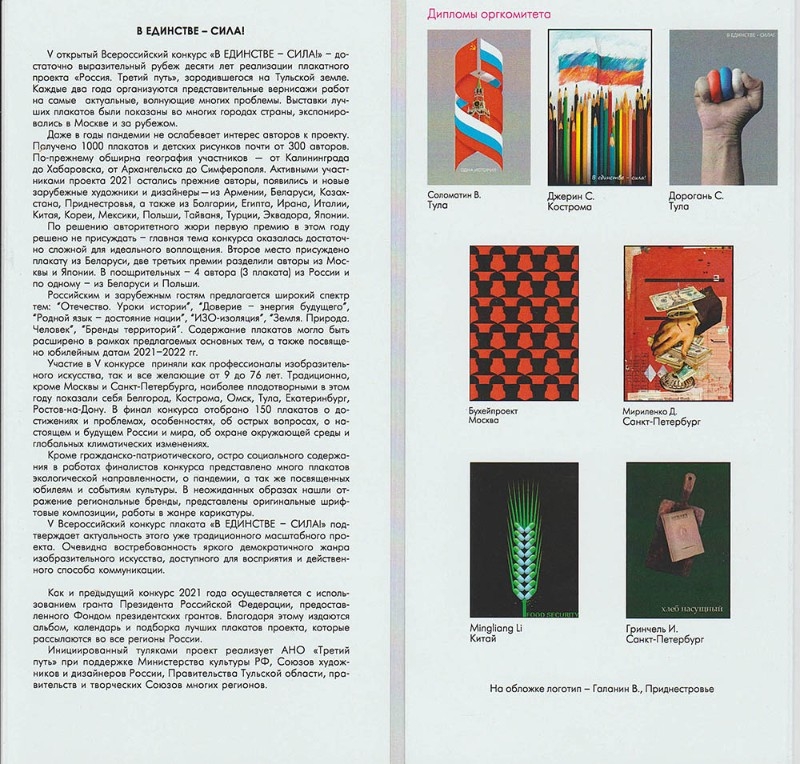 4 февраля открылась выставка Пятого Всероссийского конкурса плаката "В ЕДИНСТВЕ — СИЛА!" проекта "Россия. Третий путь". Участников церемонии открытия приветствовали заместитель директора по научной и экспозиционно-выставочной деятельности Тульского государственного музея оружия Пинк И.Б., заместитель главы администрации города Тулы по социальной политике Фельдман И.Л., организатор, руководитель и участник плакатного проекта «Россия. Третий путь» Дорогань С.И., руководитель пресс-службы музея «Куликово поле» Котикова Л.С., член правления Калужской областной организации «Союз художников России» Мантулин М.Б. В этом году почти 300 авторов в возрасте от 9 до 76 лет прислали на конкурс 1000 своих работ из Армении, Беларуси, Казахстана, Приднестровья, Болгарии, Египта, Ирана, Италии, Китая, Кореи, Мексики, Польши, Тайваня, Турции, Эквадора, Японии и других стран. Конкурс реализуется на средства президентского гранта. Будет издан альбом, календарь и подборка лучших плакатов проекта. В этом году тематика конкурса расширилась: авторы смогли рассказать о мировых достижениях и проблемах, о нравственном и физическом здоровье, о будущем России и мира, охране окружающей среды и других важных темах. По решению авторитетного жюри первую премию в этом году решено не присуждать: главная тема конкурса оказалась сложной для идеального воплощения. Второе место присуждено плакату из Беларуси, две третьих премии разделили авторы из Москвы и Японии. В пяти поощрительных — 3 плаката россиян и по одному из Беларуси и Польши. Диплом оргкомитета получил преподаватель Тульской ДХШ им. В.Д. Поленова Владимир Соломатин, выпускница школы Головкина Ольга стала участником итоговой выставки. Выставка проходит в Тульском музее оружия по адресу ул. Октябрьская, 2 и продлится до 20 февраля. Вход по QR-кодам.