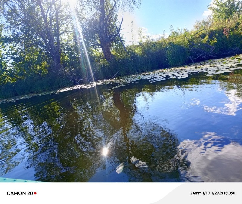 После обеда мы поплыли на лодке по озёрам. Озеро Синицыно, Щучье, Круглое... Моторная лодка набирала скорость, за ней бурлил и пенился поток, оставляя длинный след на воде. Навстречу неслись, деревья, брызги, солнечные блики, ветер, птицы, облака... Все заросло камышами и кувшинками. А моя самая легкая лодка в мире летела мимо них вперед. Она ведь легче и быстрее моторной! Иногда она останавливалась и стояла в тишине. Тогда мне вновь вспоминался юмор Юрия Коваля. Он пишет в книге, что собирался порыбачить и взял с собой для приманки рыбы немного овсяных хлопьев, а они просыпались и стали медленно тонуть в темной воде. Автору представилось, что на дне сидит дух озера – Папашка, а вместе с ним – его подчинённые, беспокойные духи озера. На них сверху медленно падает геркулес… И вот сидят они, бесы, обсыпанные геркулесом. Ну, и не довольны, конечно!