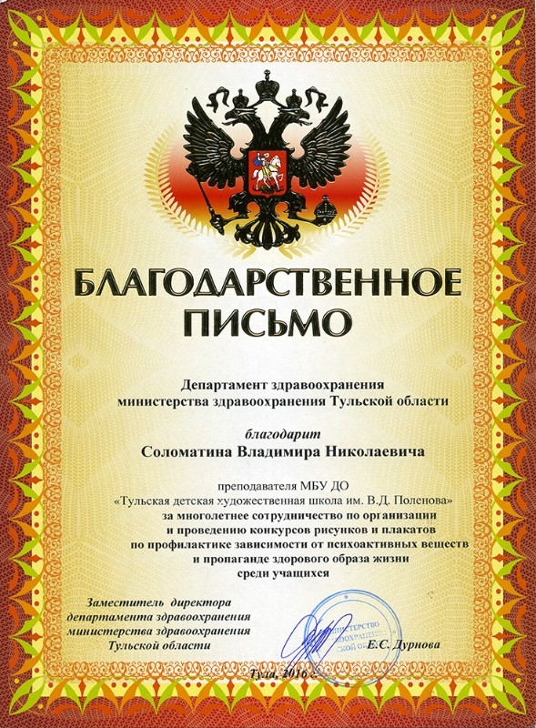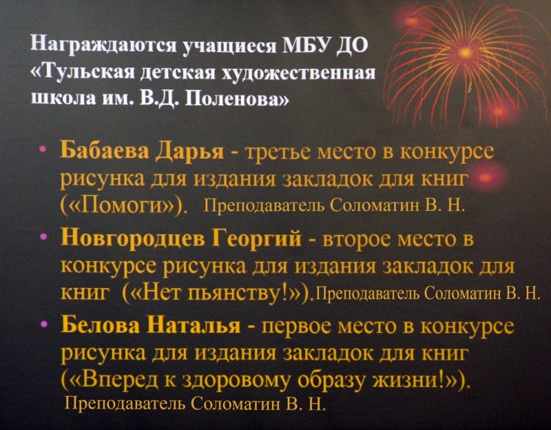 8 апреля 2016 года в МБУ "Молодежный центр "РОДИНА" в городе Туле состоялось торжественное награждение учащихся ТДХШ им. В. Д. Поленова. Победителями конкурса детского рисунка и плаката "Здоровый образ жизни" стали учащиеся: Белова Наталья — 1 место, преподаватель Соломатин В. Н., Новгородцев Георгий — 2 место, преподаватель Соломатин В. Н., Бабаева Дарья — 3 место, преподаватель Соломатин В. Н. Конкурс организован министерством здравоохранения Тульской области. По итогам конкурса были напечатаны большим тиражом закладки для книг с плакатами, выполненными учащимися нашей школы.
